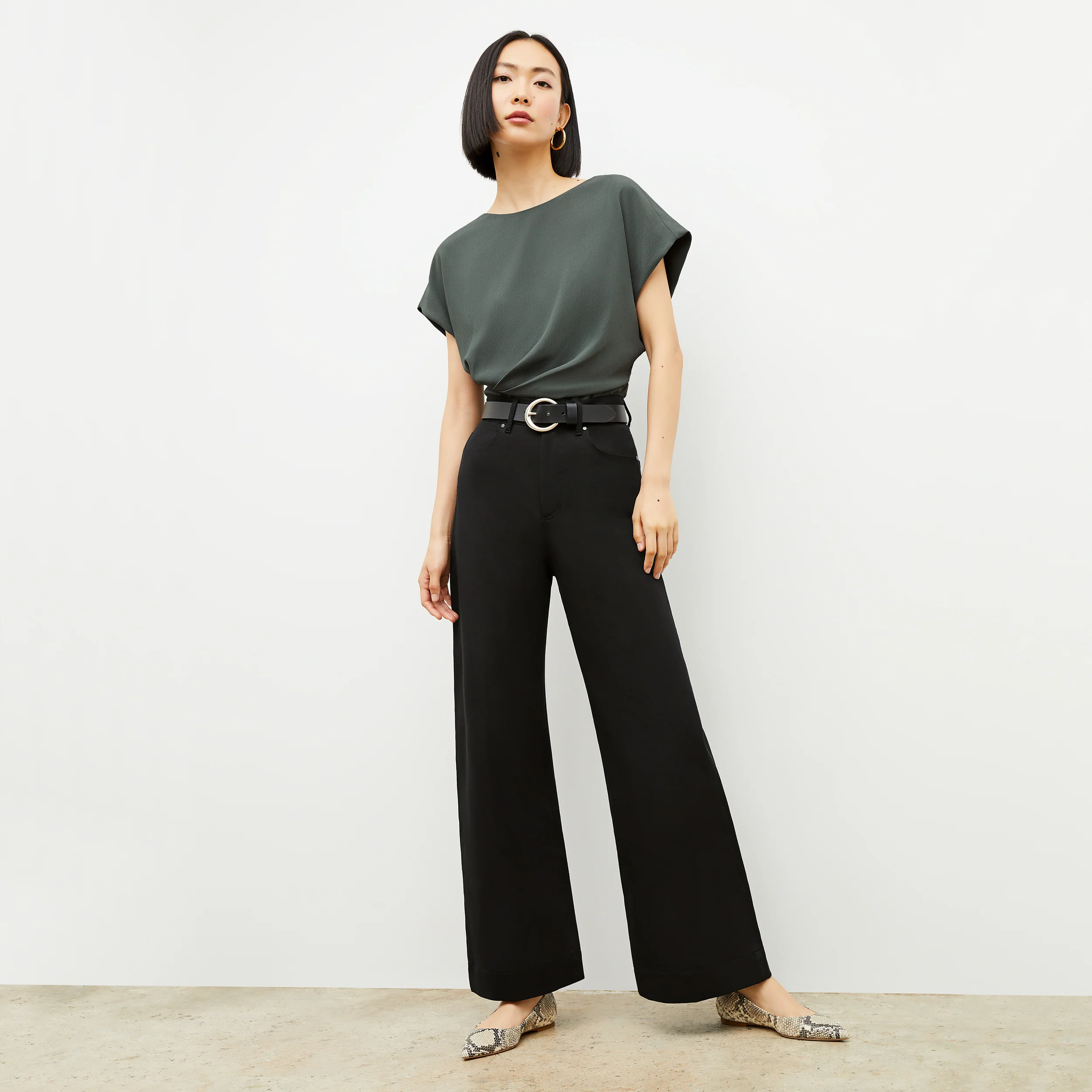 This trouser belt features a slightly exaggerated circular buckle that adds oomph to your outfit. It works with both high-waisted and mid-rise pants. If you plan to wear this belt over a dress at the natural waist, we recommend sizing down.