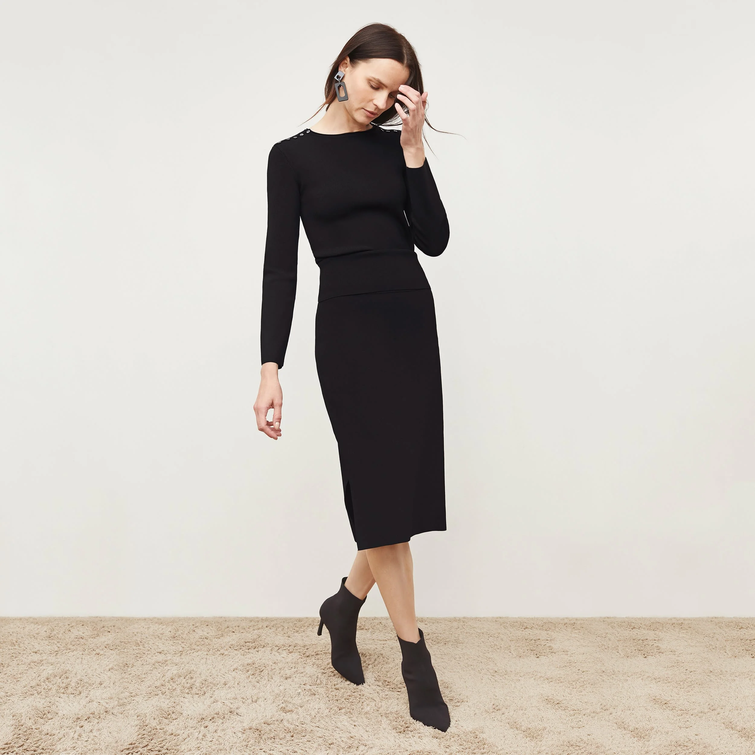 Crafted from the same stretchy-yet-structured yarn as our jardigans, the Malin top features a boat neck, long sleeves, and not-too-tight fit through the body. Shell buttons at the shoulder seams add a touch of glitz.