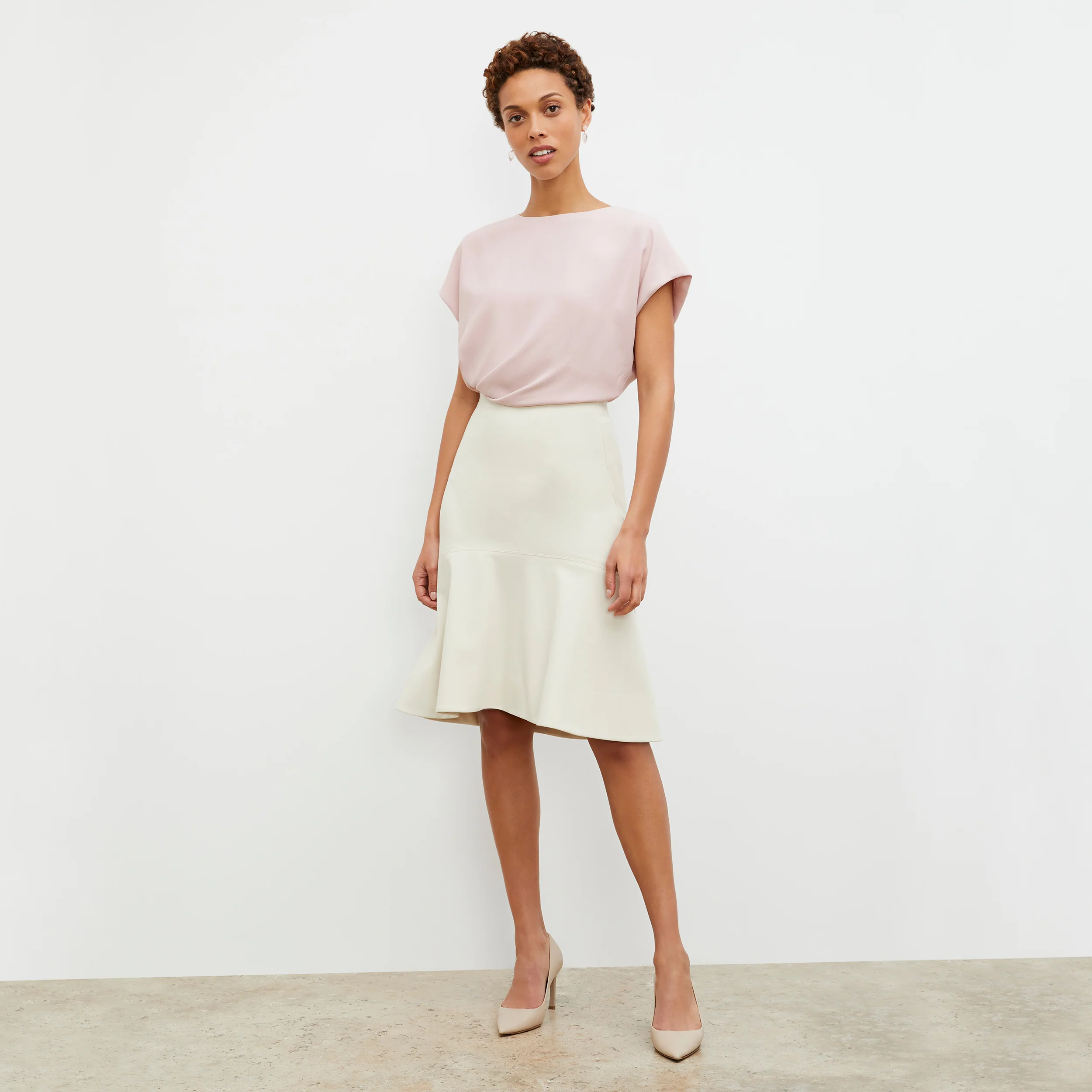 The Nejvi top is the intersection of three of our favorite things: a classic tee shape, elegant draping, and machine-washable, travel-friendly fabric. A seam at the natural waist counters a relaxed fit through the shoulders and chest, creating a sleek shape.